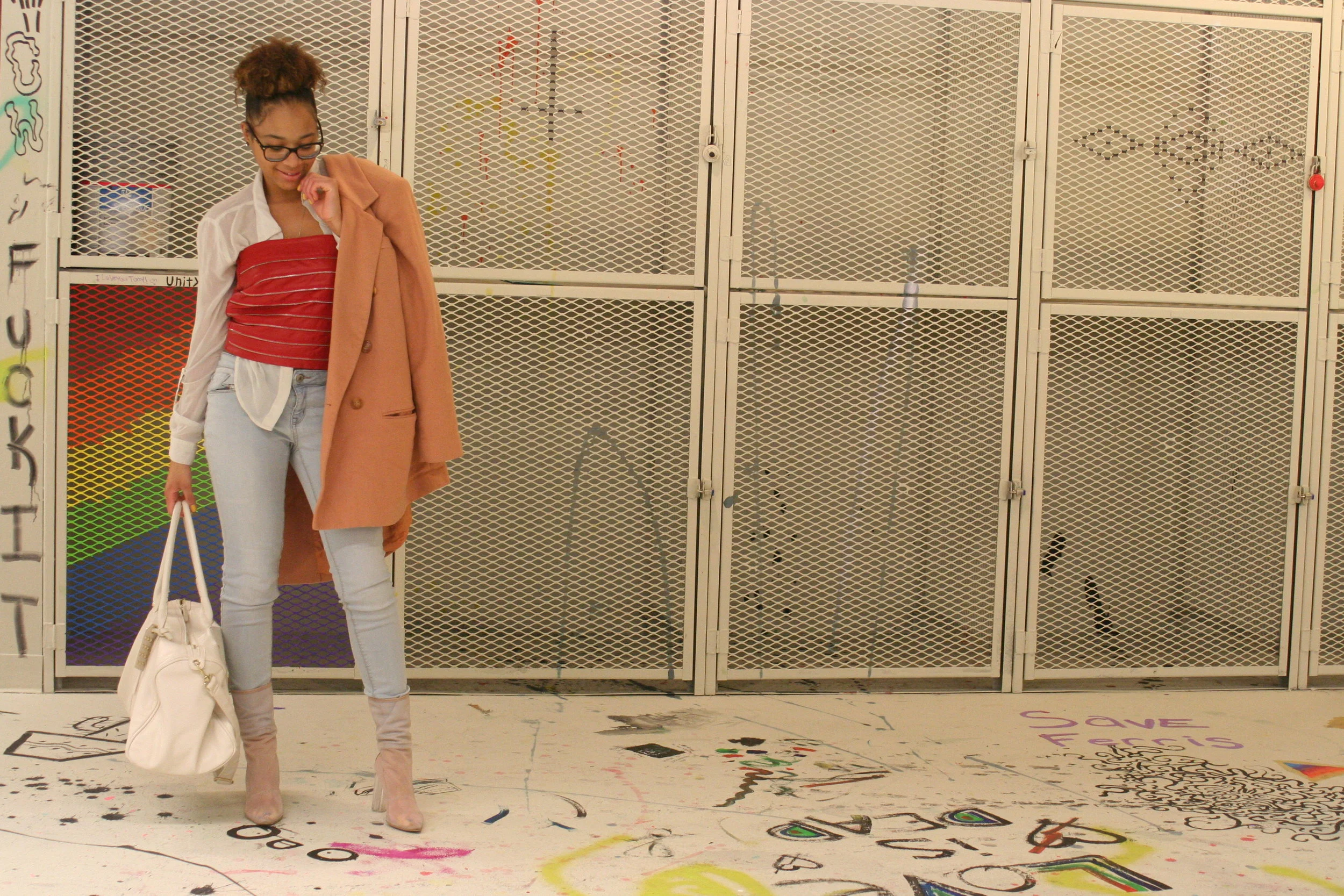 Zipper skirt: Unknown boutique// White button up: Forever 21// Coat: Thrifted for $4// Jeans: Forever 21// Shoes: Ego//