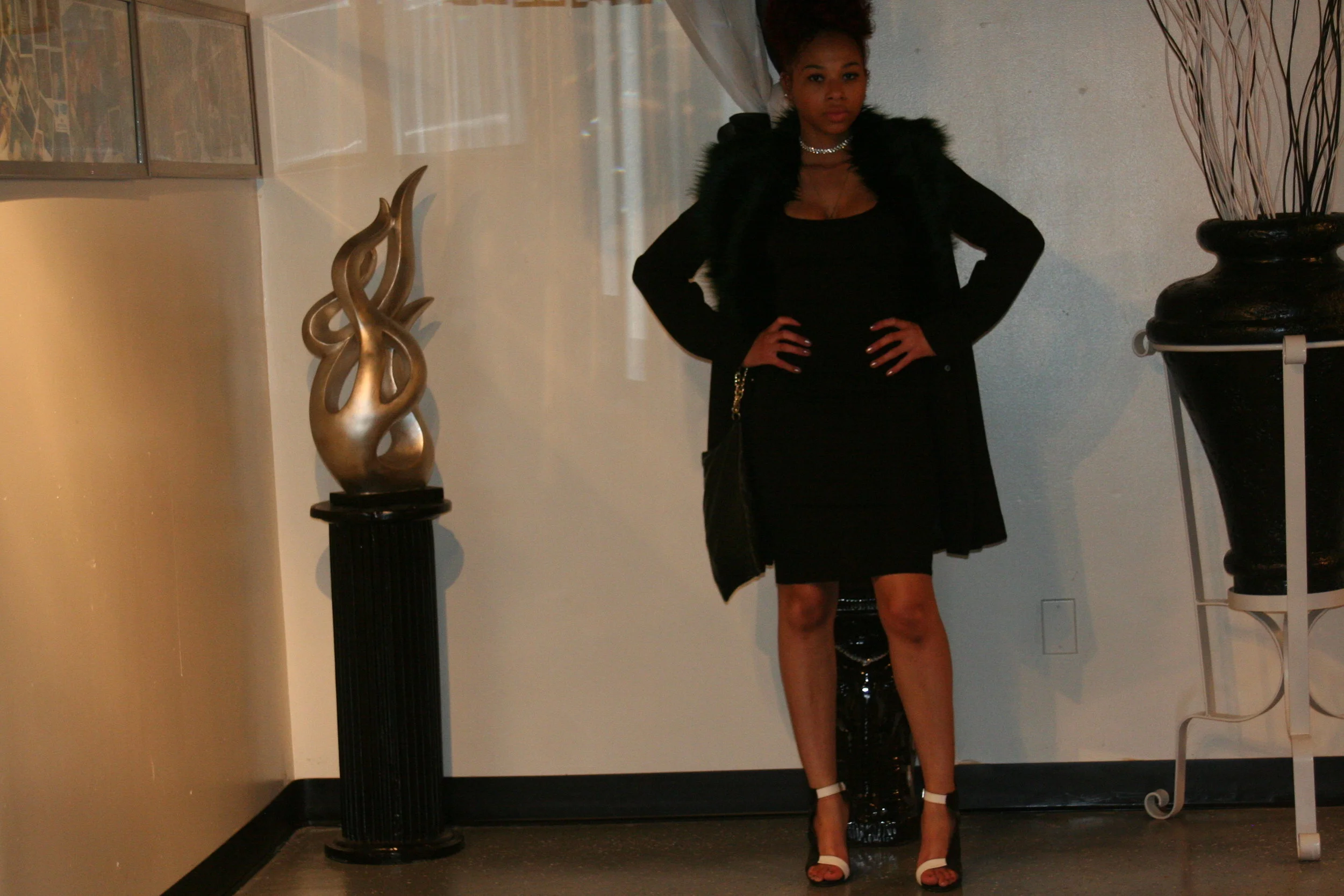 I decided to wear this all black coat with this emerald green fur collar that I absolutely love and good thing is that the green wasn't bright and you could only tell it was green up close. Also I wore shoes that had a tad bit of white on them and they tied the look together and made it unique.