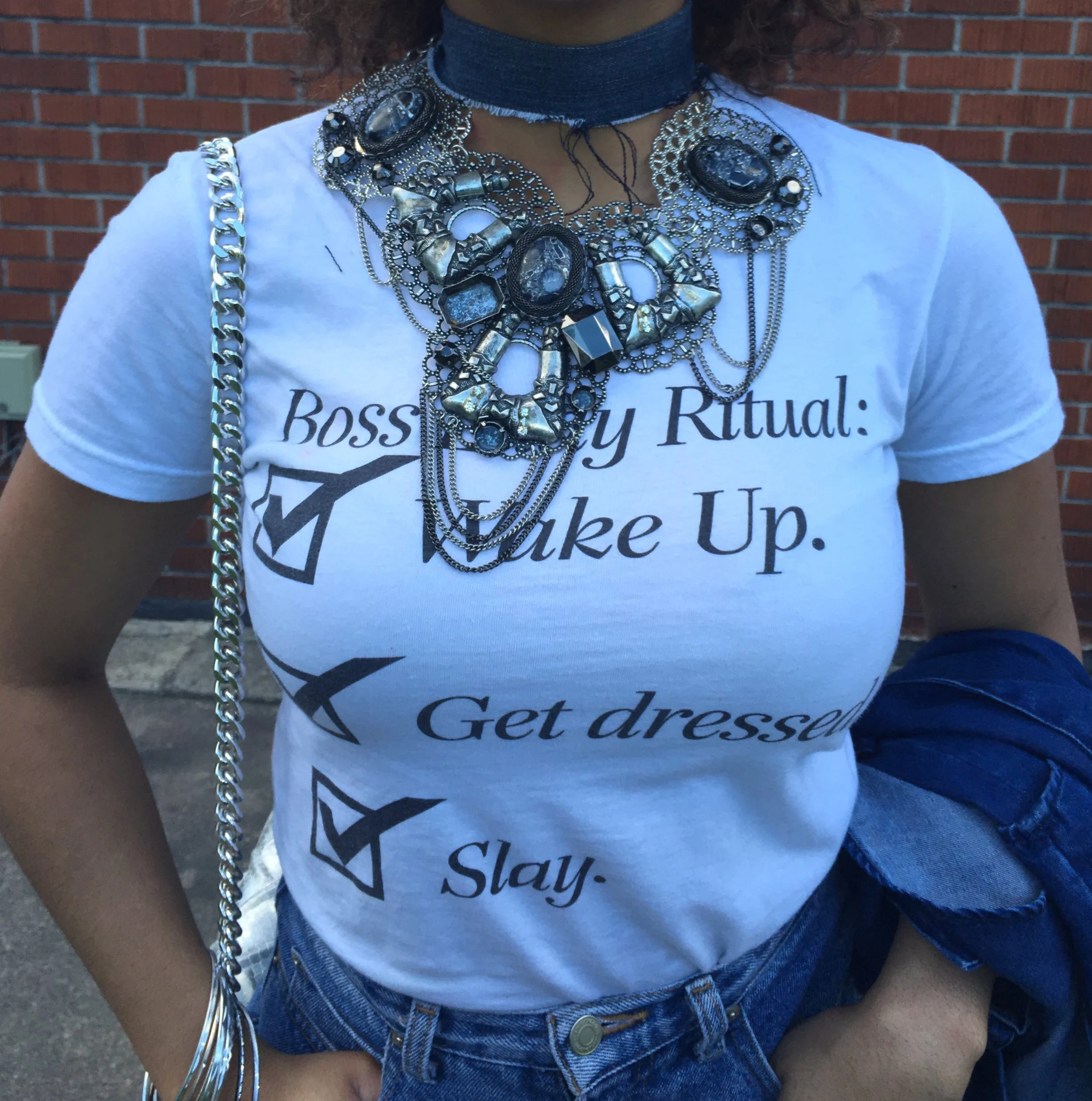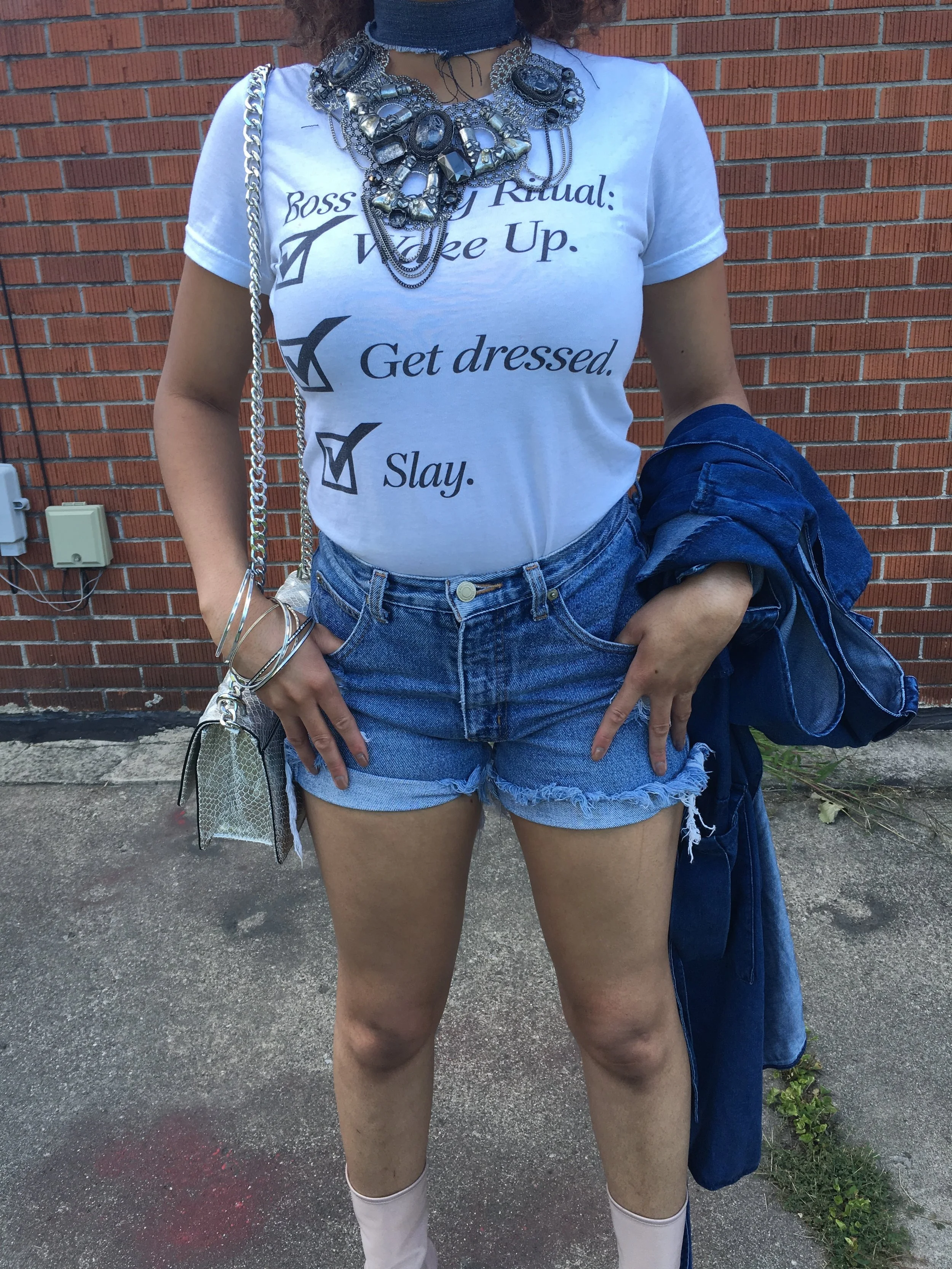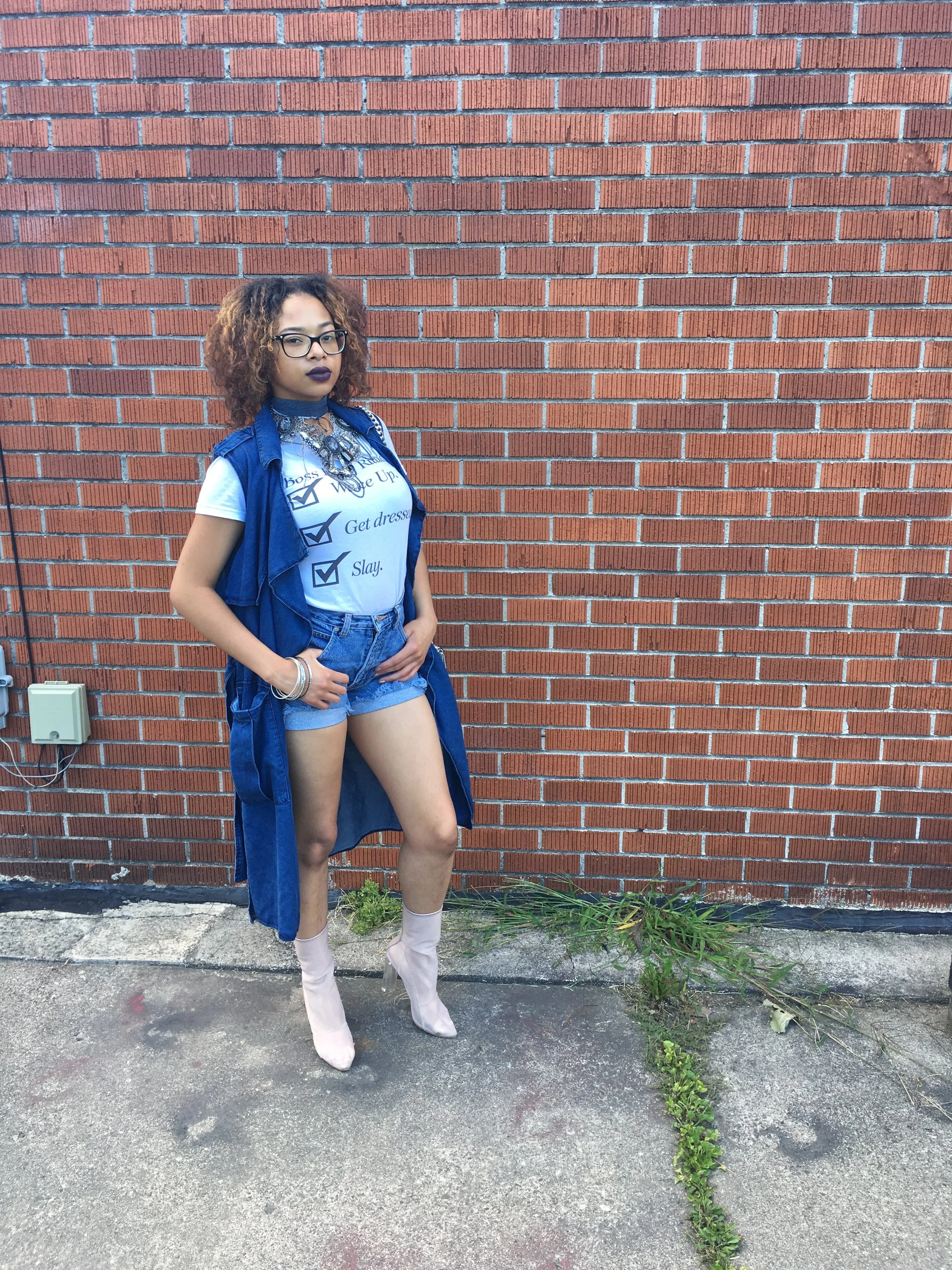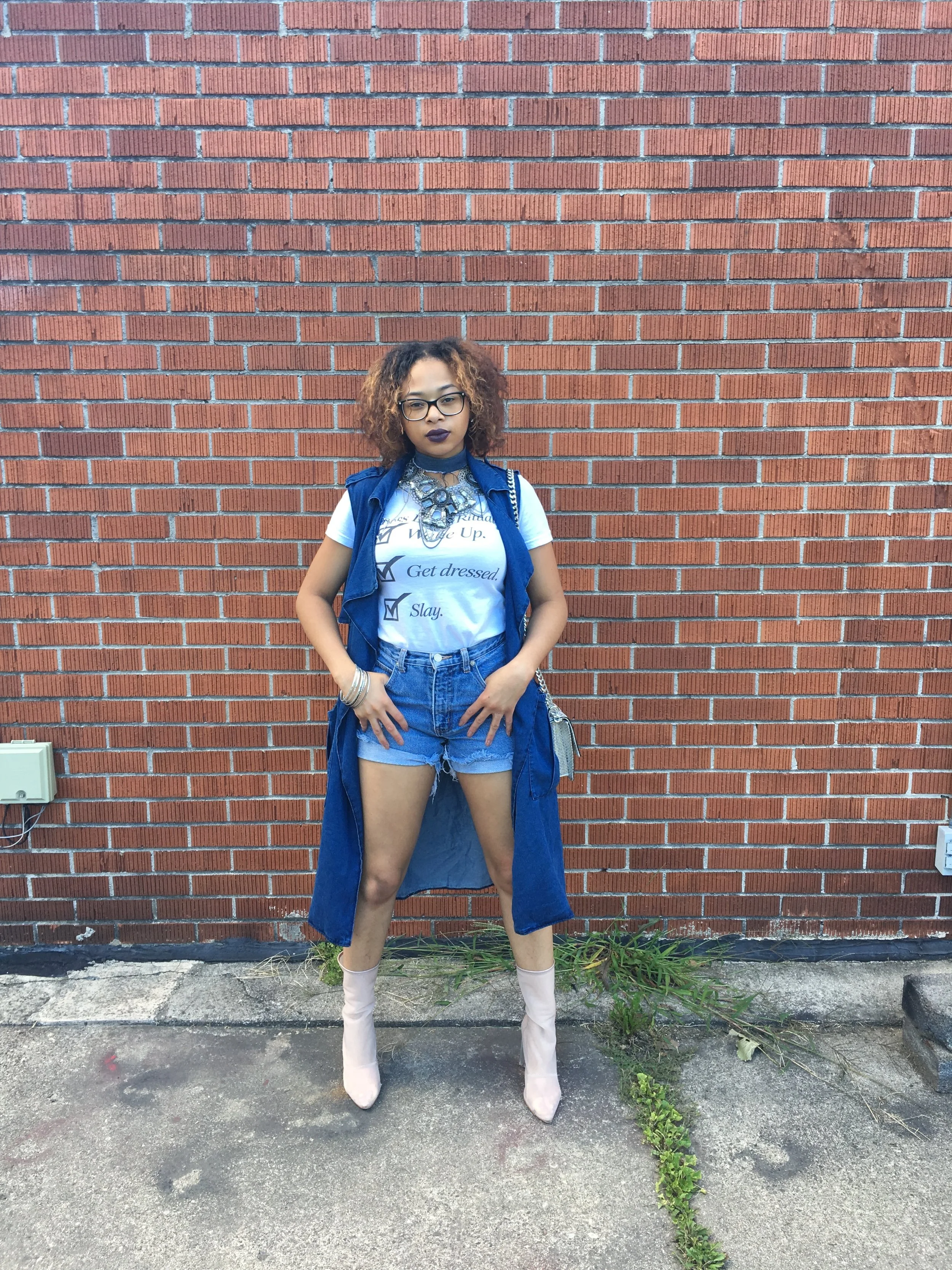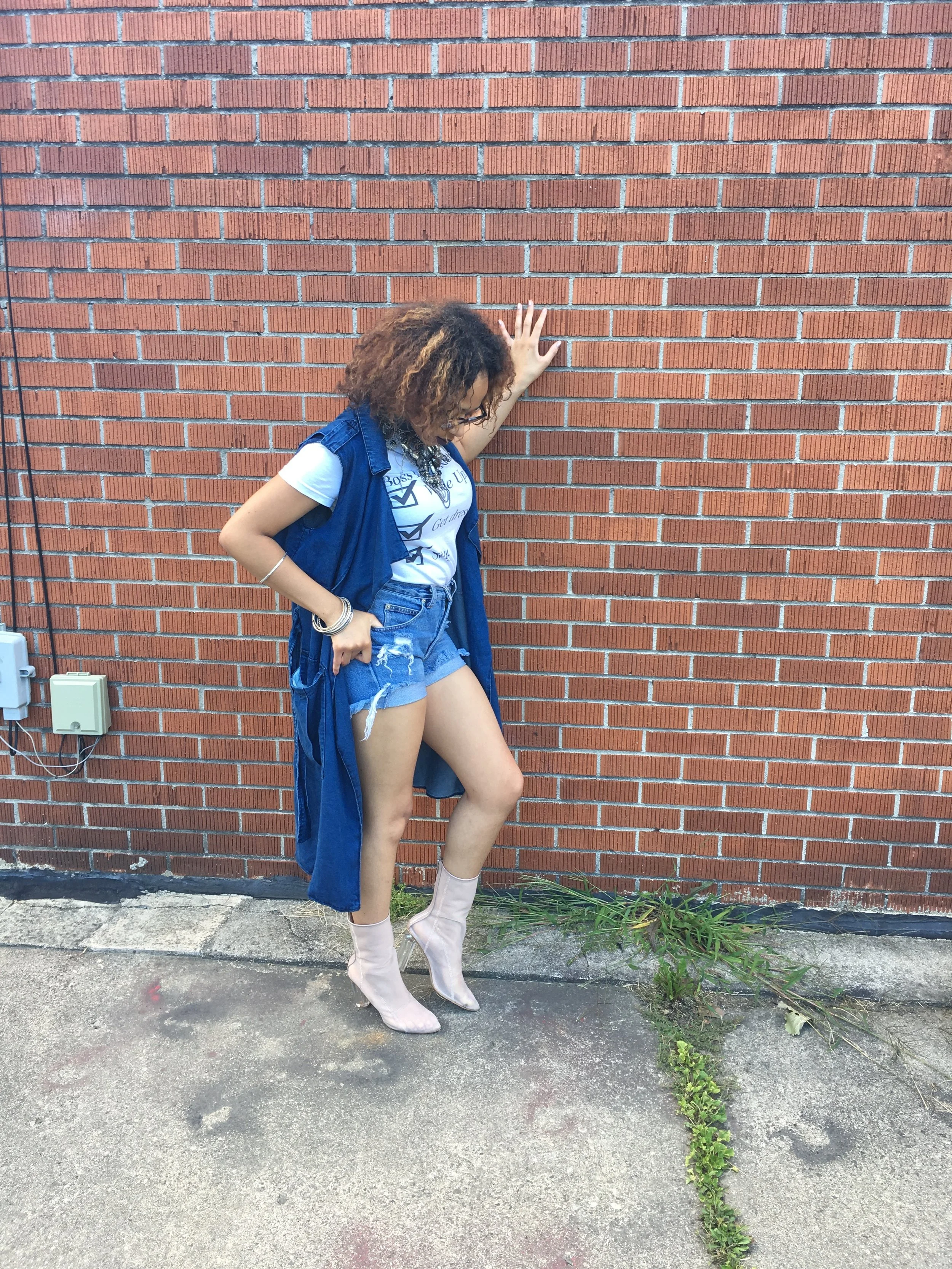Denim x Denim is always a great combination, it always has been and always will be. You can achieve a denim on denim look in so many different ways. I decided to pair my denim shorts and denim duster(which I love and is great for all seasons) with one of my 'Boss Lady Ritual' t-shirts and the mesh heels that I am in love with! This look was fun and very chill yet super cute!