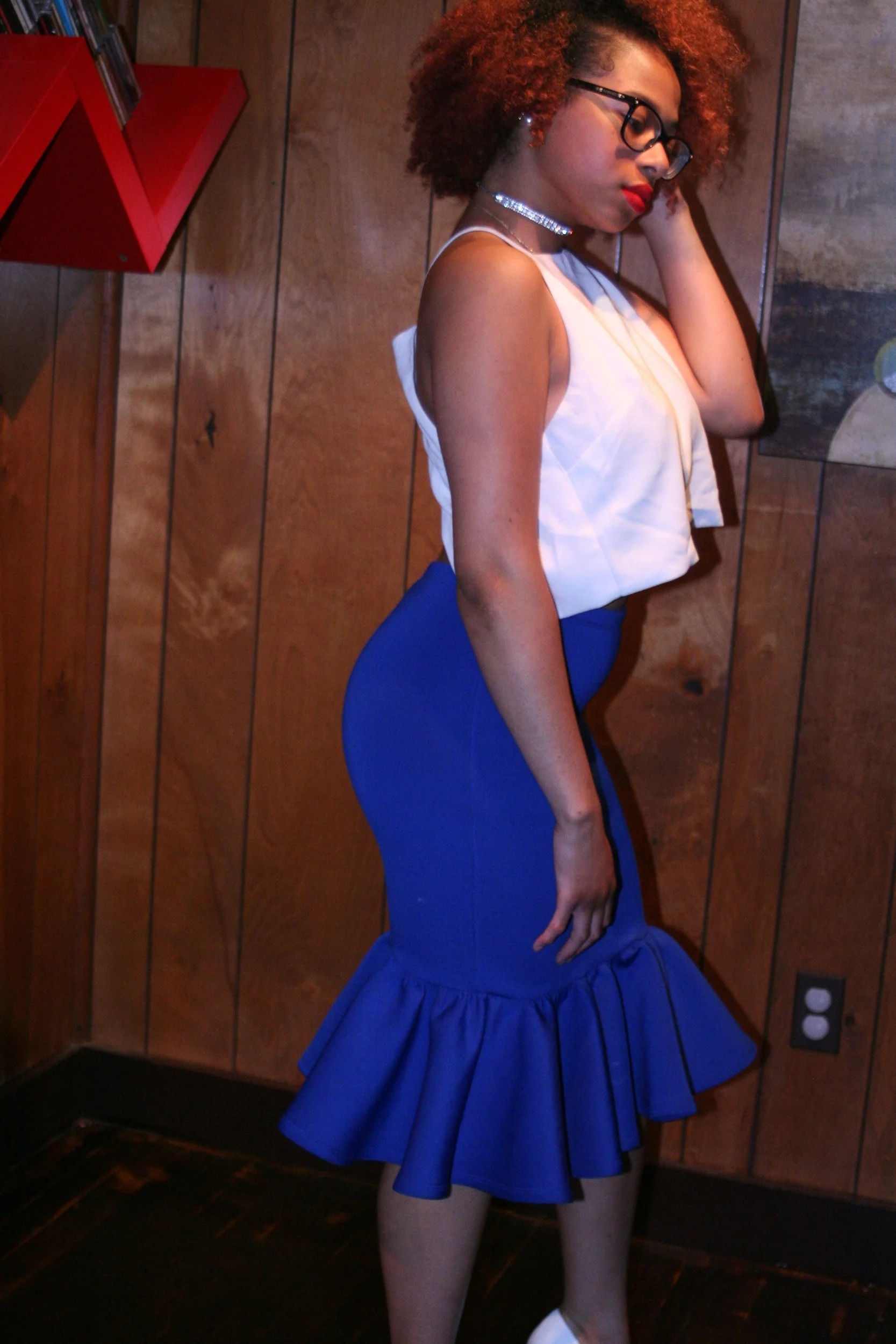 Here I wore this beautiful skirt that was a fitted scuba material (fits like a glove but isn't tight AT ALL), I love this skirt because it's a statement on it's own and you don't have to do much with the rest of the outfit to make it cute. I paired the skirt with a loose/flowy shirt to balance out the look but still keep it together and the shirt was open in the back because details are important!