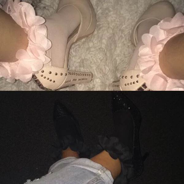 These ruffled socks are everything! They are the ultimate girly accessory, when I saw them I just had to get them in both colors(if they had other colors I would've gotten them all), they are a major fashion statement and can spice up any outfit, they are best paired with pointed toe heels, but as you can see I paired the pink socks with a pair of Just Fab round toe shoes and it came out so cute. These socks give a very chic and classy appearance and they're very affordable, I got them for $8.50 at Nordstrom(can you believe they were only $8.50?Yeah well  I can't either!) Girl you better go grab you some!