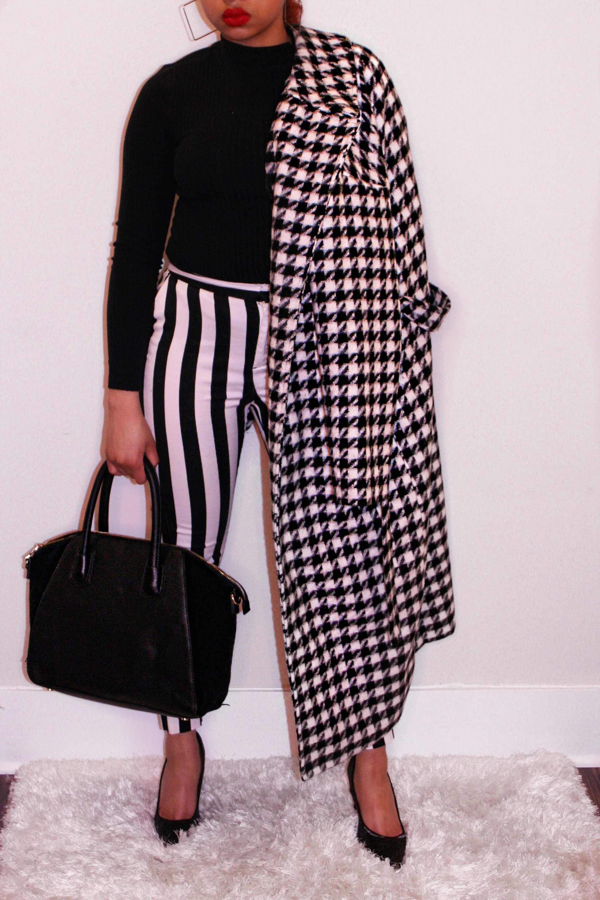 With this look I added some white into the black, I stuck with the black top but using a turtleneck to make the look more chic, also adding some white to spice it up. I chose stripped black and white pants to add some contrast because remember we aren’t being basic with our black right now. I stuck with the all black for the shoes and purse to tie everything all together and still keep it simple with accessories. The biggest thing I did to spice up my black was this black and white coat! This coat was the perfect piece to add to make this outfit a perfect way to incorporate different colors into your black look. This red lip was the perfect lipstick because a red lip is perfect with any outfit especially with black. This look is perfect for work or after work dinner because it is very professional, includes black but is definitely NOT basic.