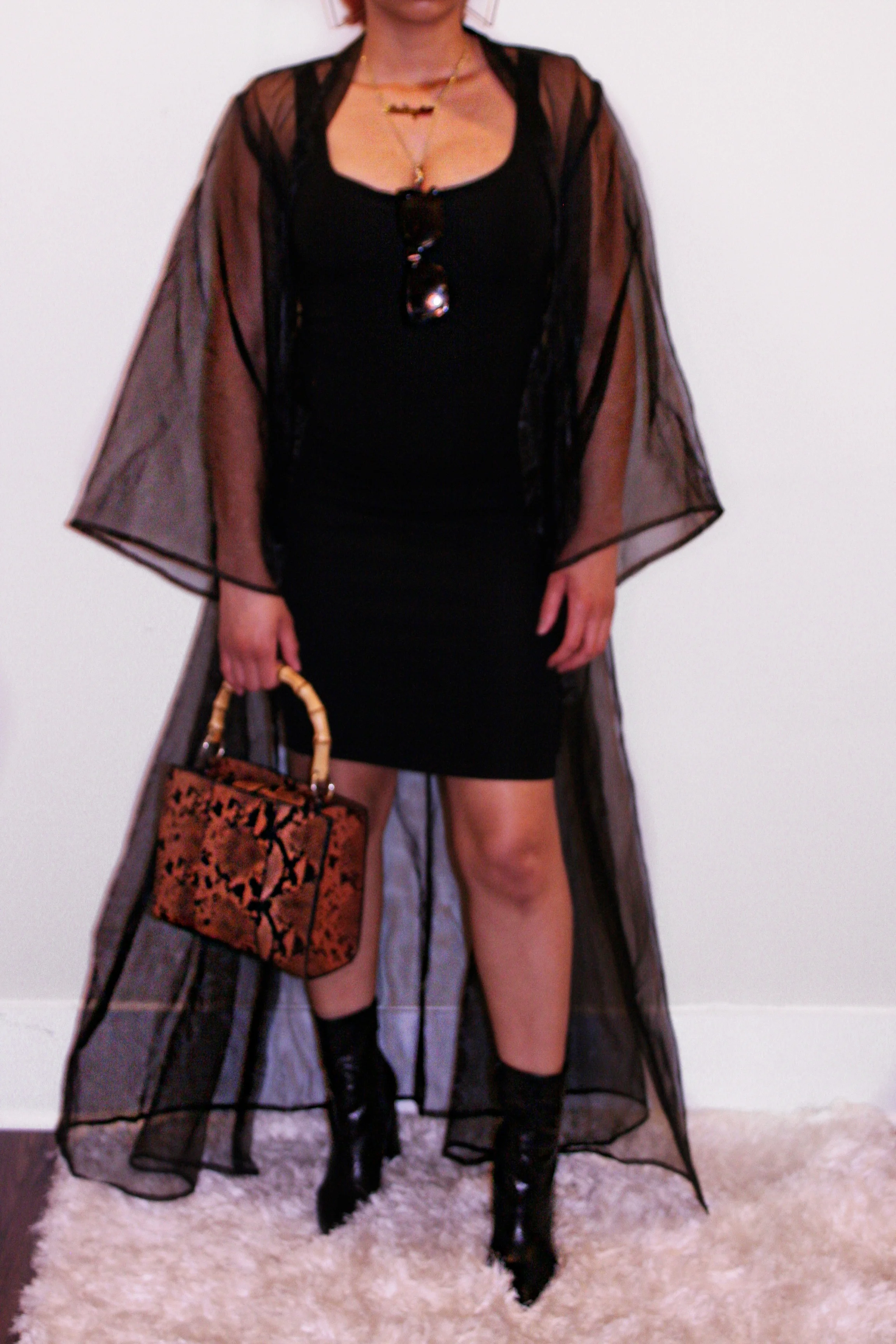 With this look we stayed all black but we added a bomb third piece to spice it up and to make the look far from basic. Y’all know I talk about third pieces all the time and I hope y’all listening because I’m telling the truth and they can really make or break an outfit. I chose a plain black tank dress as my canvas, added a black a sheer black kimono and short black boots with snakeskin detail. With black it’s always great to add a pop of color or a popping piece even if it’s an accessory, so I chose to add this brown and black snakeskin bag with a bamboo handle. Although this look was all black I added dimension by adding a cute colorful bag, adding a jacket with detail and structure and adding shoes that were black but detailed with a cute silhouette. This look is perfect for a night out with your girls or you can change the canvas to black pants and a black top but keep the third piece and cute accessories and wear this look to work. Overall this isn’t your basic all black outfit and you didn’t even have to do much.
