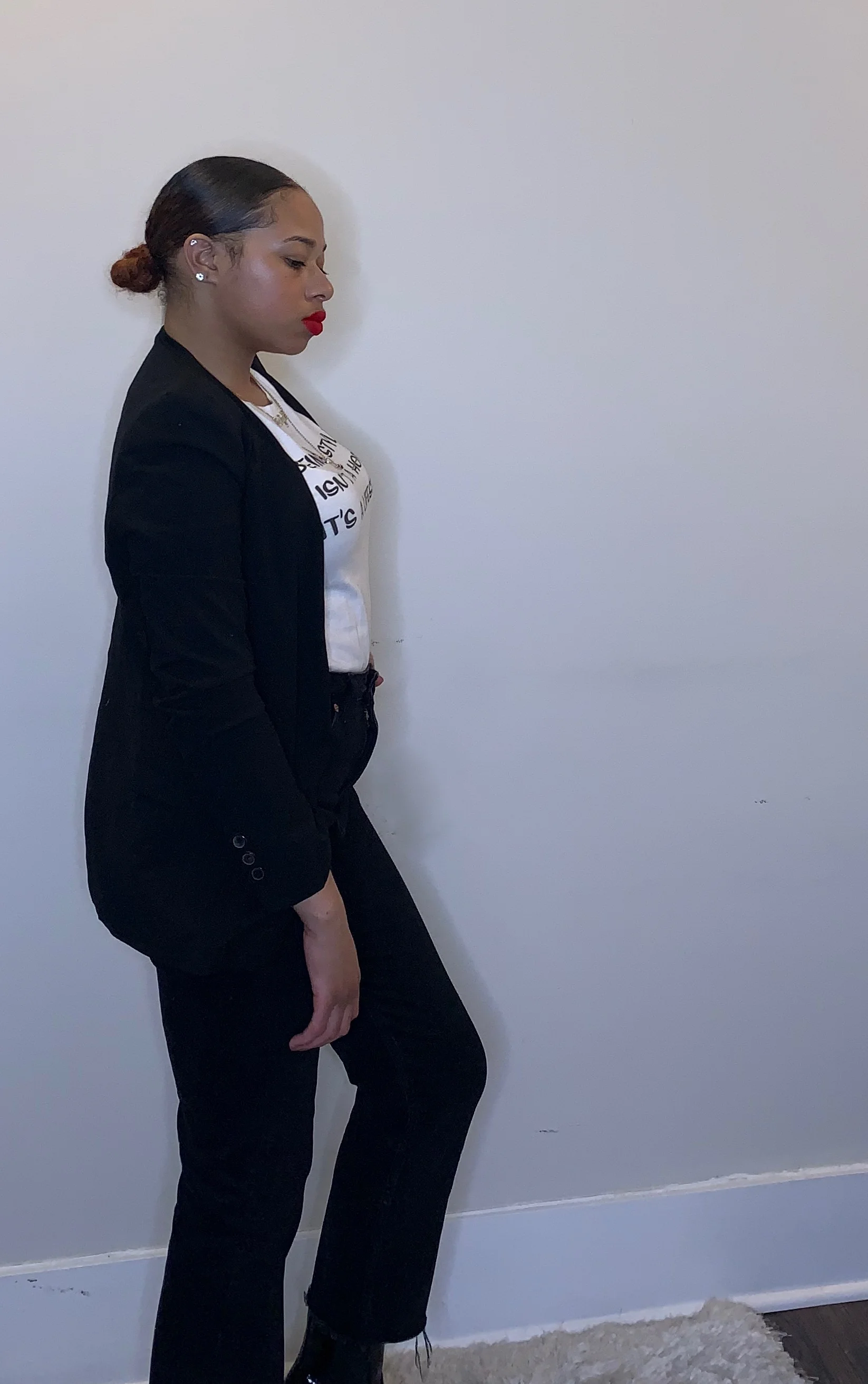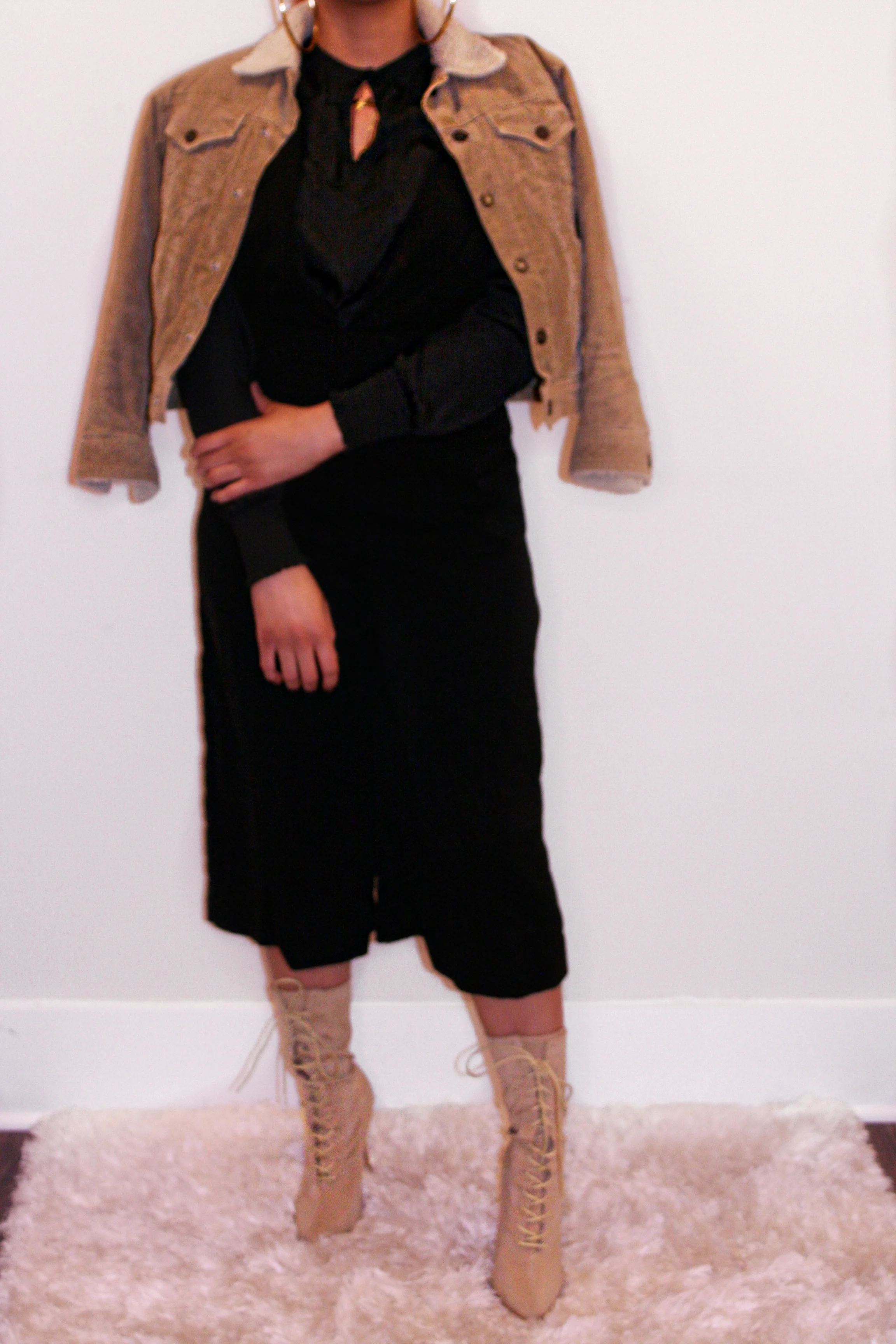 With this look it was all about the layering but we still kept it all black . This look is perfect for work, happy hour, a weekend with the girls, and brunch which is why it’s perfect. We grabbed a black silk blouse That has a keyhole button and is fitted at the wrists we layered that under sleeveless overalls (Because we love pieces that are multi-seasonal) and we added a corduroy jacket over our shoulder with tied booties that matched, This look again was simply just adding a third piece and cute accessories. Taking Black from boring to basic isn’t that difficult when you really think about it