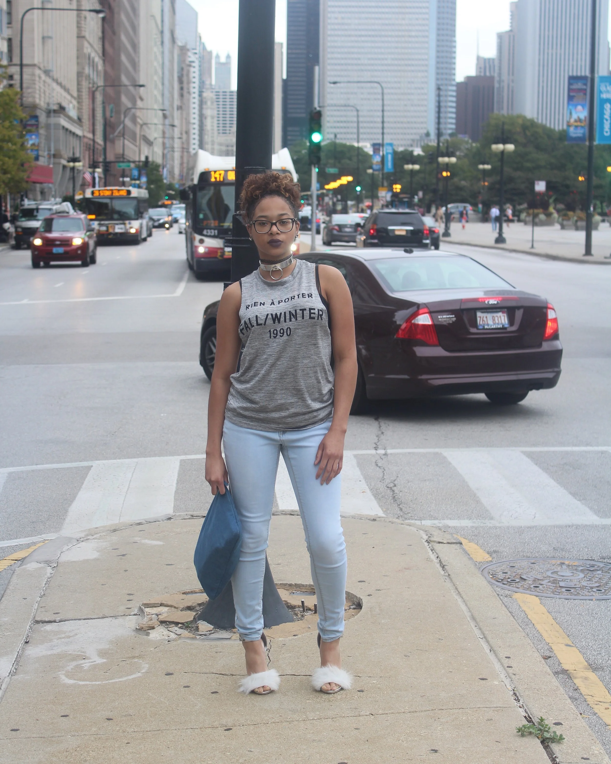 Living in a big city gives me even more of a reason to want to treat the world like it's my runway, the fast pace and hectic vibes make you feel like there's always something going on, which personally makes me want to always look more extravagant than normal. On this particular day I wanted to be comfortable but still very stylish, I paired these faux fur heels I made with Jeans and just a regular t-shirt from Forever 21 and a denim clutch, very simple yet very chic!