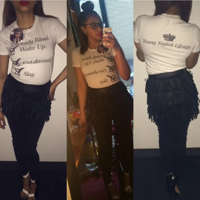 Have you ever wanted to achieve a certain look but didn't feel like you had the right clothes in your closet? Well you probably do have them you just have to be creative with what you have! I have used so many pieces of clothing for something other than what it was, for instance I've used dresses and skirts as shirts and in this picture I used a fringe skirt as a belt, I loved the look of a fringe belt, but I didn't have one nor did I feel like buying one, but I had this skirt from a few years ago that was now too short so I got the bright idea to use it as a belt and the outfit came off as I pictured, I paired the fringe skirt (or should I say belt lol) with the new Young $tylish Lifestyle "Boss Lady Ritual" t-shirt(which will be ready to order soon), Forever 21 black jeans , and black and white heels from Sheikh shoes. I loved this look and will be doing it again. When you want to create new looks but you either don't want to spend the money or don't have the money to spend then use the resources you already have and just get creative with your clothes and you can make all new looks, nobody has to know the shirt you're wearing is actually a dress or the dress you're wearing is just a over-sized shirt. Have fun with your clothes and get creative without spending money but make sure you don't look crazy!