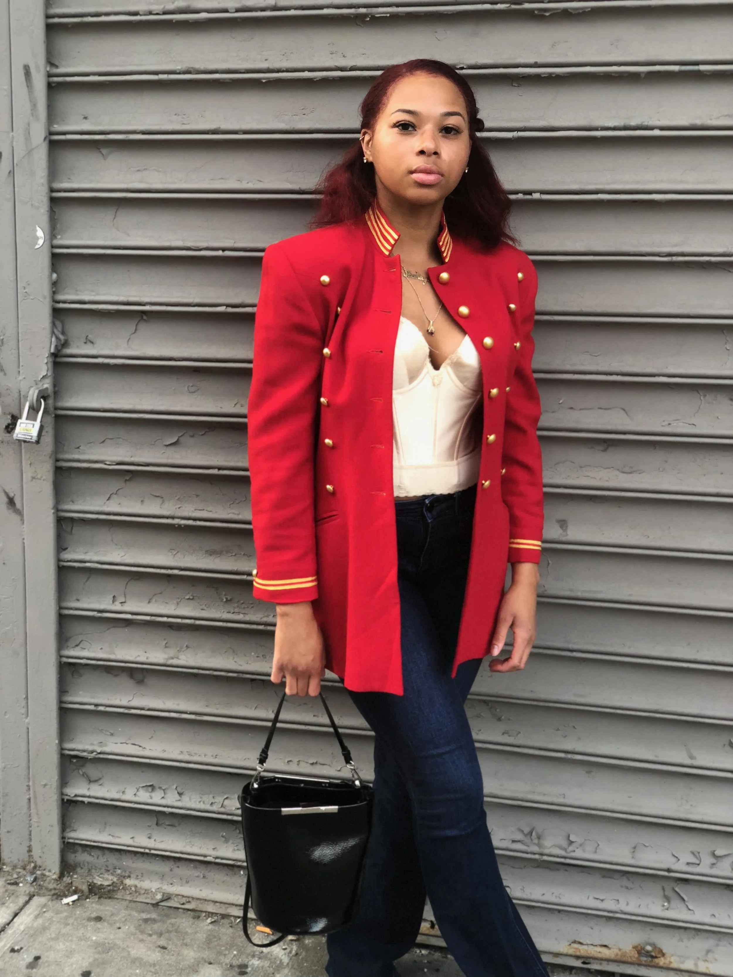 Although I wore seven different outfits, but this look has to be my favorite! It was all thrifted by an amazing vintage brand Girl Goodies! i chose to pair the bustier with the sailor/military inspired jacket because I felt that it gave the look a great 80s look especially with the jacket having padded shoulders. I then paired the bustier and jacket with some amazing fitting flared jeans, Being in New York it's so much walking involved that I had to wear flats, but I would've definitely worn heels with it. This look is perfect for a date night, brunch, girls night or anything that you need a cute look for that's just the right amount of fashions.