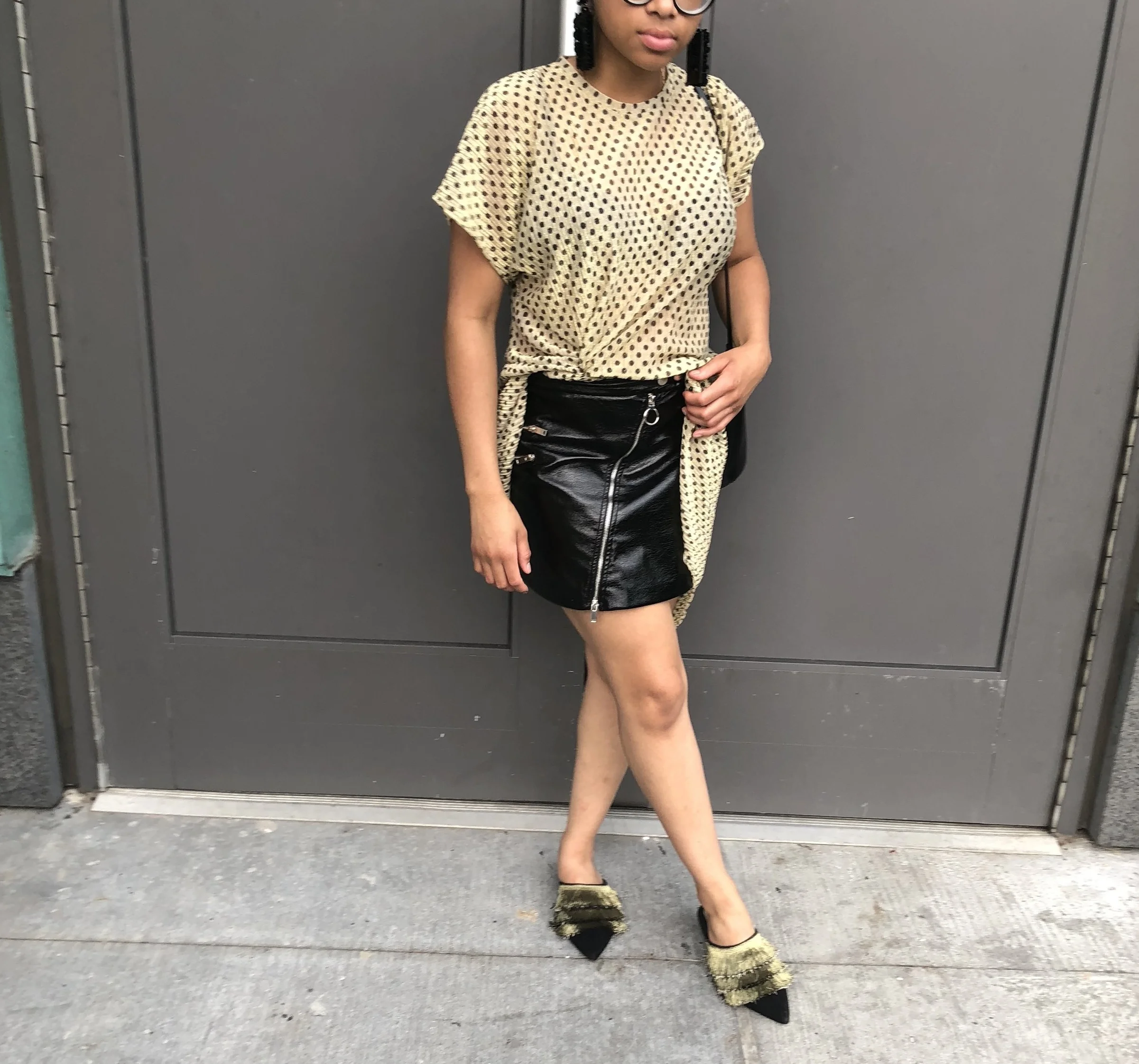 I got this sheer gold polka dot shirt from Zara for $7, it is asymmetric with a knot in the front, it was so cute that I just had to get it especially because I knew I could pair so many things with it. I chose to pair it with my patent leather skirt that zips up the front just to keep things simple but textured. I didn't need to do too much with my bottoms because my shirt and accessories were so cute. Once I got the outfit down pack it was on to the accessories, I had found these amazing earrings that were in a square shape with sequins material flowers and they ended up being the only piece of jewelry I needed.