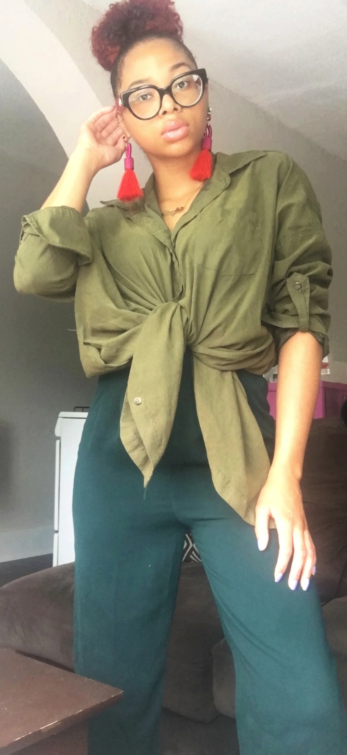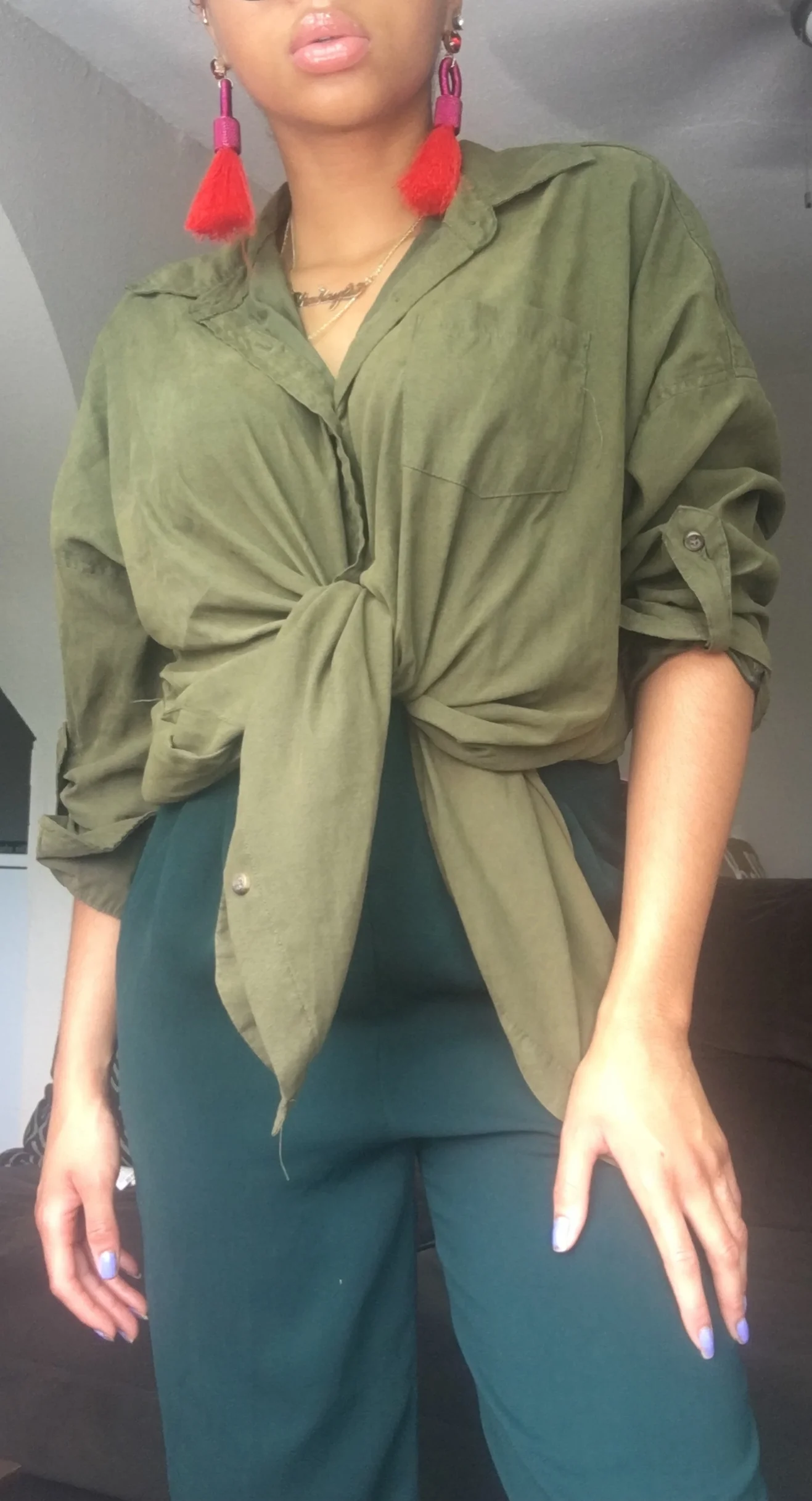 I love mixing colors, being monochromatic and also mixing color that are in the same color family but are different. For this outfit I chose to stay in the families of green and blue and I ended up loving it! I paired these high waist teal trousers with this olive green shirt that I love, but I tied it so that you can still see the beautiful waist on these pants.
